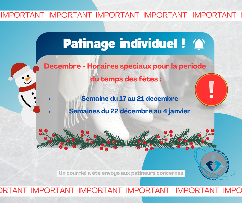 Le patinage individuel, ou cours privés ou semi-privés, est la suite du programme Patinage Plus. Le patinage individuel est un programme offert par le Club où les patineurs s'entraînent aux différentes disciplines du patinage artistique soit, le style libre, les danses, les habiletés de patinage, l'artistique et le patinage synchronisé. Unique au Canada, le patinage STAR enseigne les habiletés de patinage artistique en leçons individuelles ou en groupe, de manière progressive et logique et offre des prix et des récompenses conçus spécialement pour ce groupe de patineurs. Ces derniers ont la possibilité de vivre les évaluations de Patinage Canada par l'intermédiaire d'un système d'évaluations national uniformisé. Les évaluations sont progressives et s'étendent dans un continuum de 10 niveaux d'évaluations. Les évaluations de niveau Star 1 à 5 sont faites dans le cadre d'un entraînement régulier, par un entraîneur-évaluateur formé et certifié. Les évaluations Star 6 et plus sont faites dans un cadre plus formel par des juges-évaluateurs.
