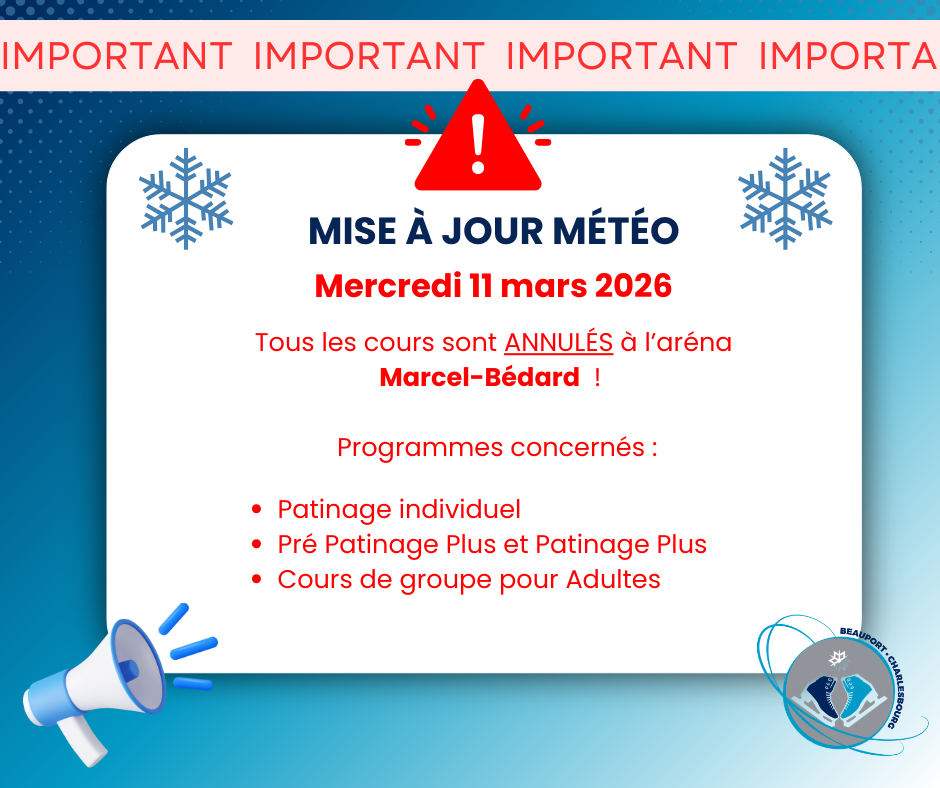 Ceci est pour vous mentionner que tous les cours de ce soir, mercredi 11 mars, à l'aréna Marcel Bédard sont ANNULÉS en raison des conditions météorologiques.