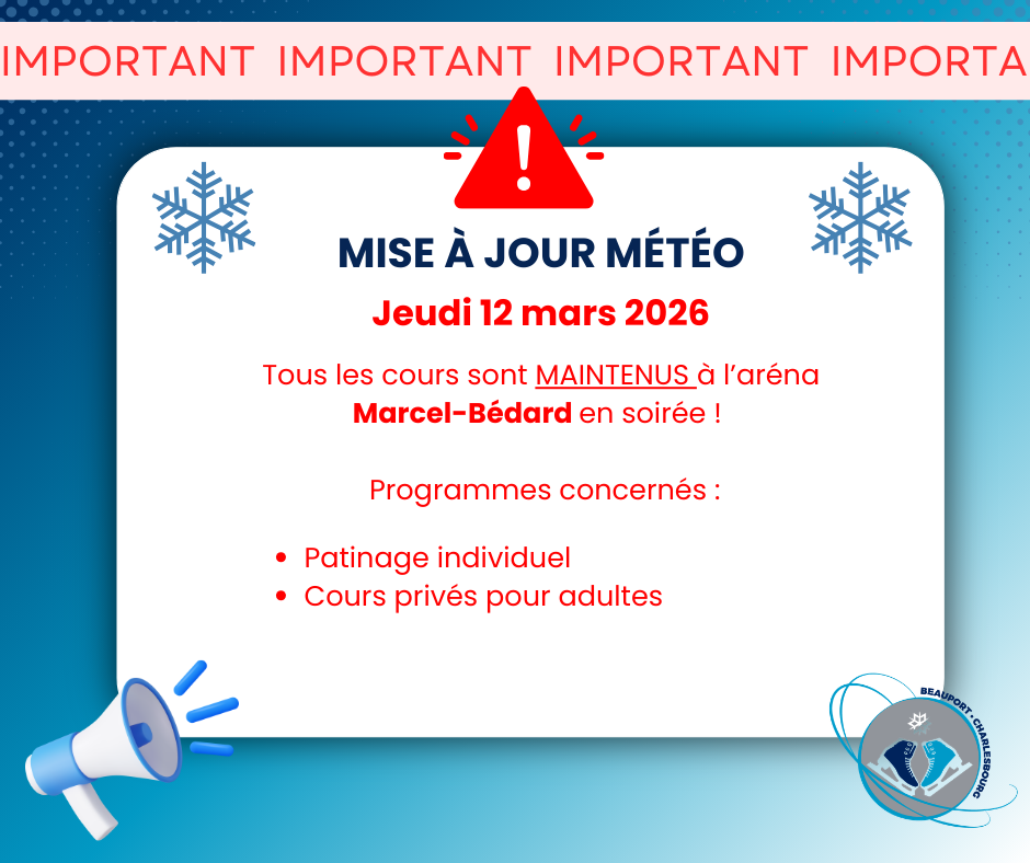 Ceci est pour vous mentionner que tous les cours de ce soir, jeudi 12 mars, à l'aréna Marcel Bédard et à l'aréna Réjean-Lemelin sont MAINTENUS.